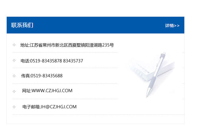 地址:常州市新北區友邦商務大廈1幢16、17層  電話:0519-85101652  傳真:0519-85112595  郵編:213022  網址:www.cz-jiayue_cn.jindianrhy.com  郵箱:xiajifengaa@163.com